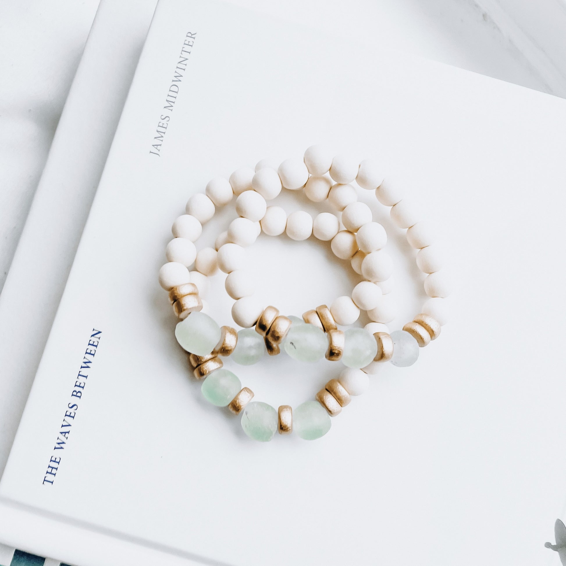 Lightweight stretchy beaded bracelets with a fair trade recycled glass bead and wood accents, handcrafted on the East Coast. Glass bead colors may vary as they are made from recycled glass bottles. Standard 7" wrist size.