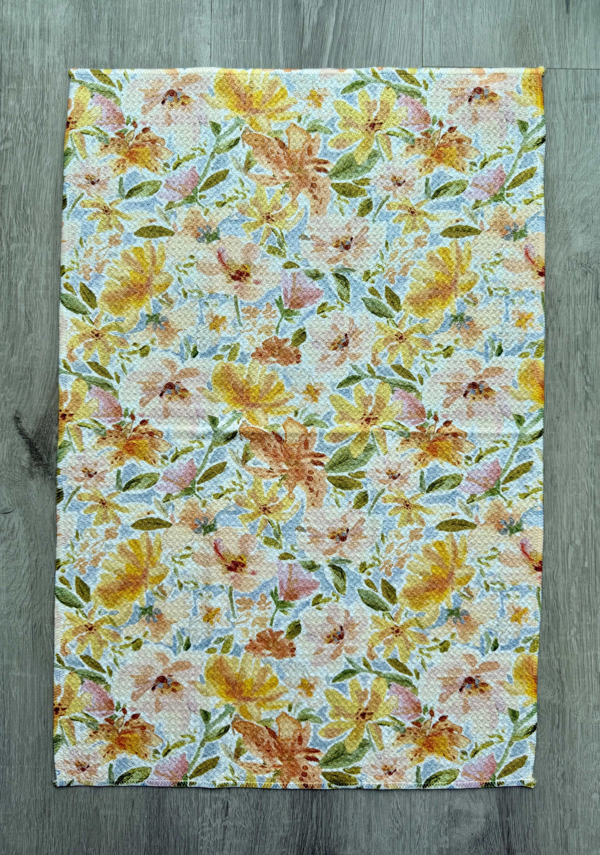 Bring a touch of delicate beauty to your kitchen with our Ethereal Garden Tea Towel. This lovely tea towel features a soft and airy watercolor-style design with gentle yellow and peach flowers, complemented by light green and blue-grey foliage, all on a textured white background. Perfect for drying dishes, adding a subtle and artistic touch to your kitchen decor, or as a sweet and charming gift. Made from high-quality, absorbent fabric for everyday use. Let the gentle hues of a dreamy garden enhance your home.