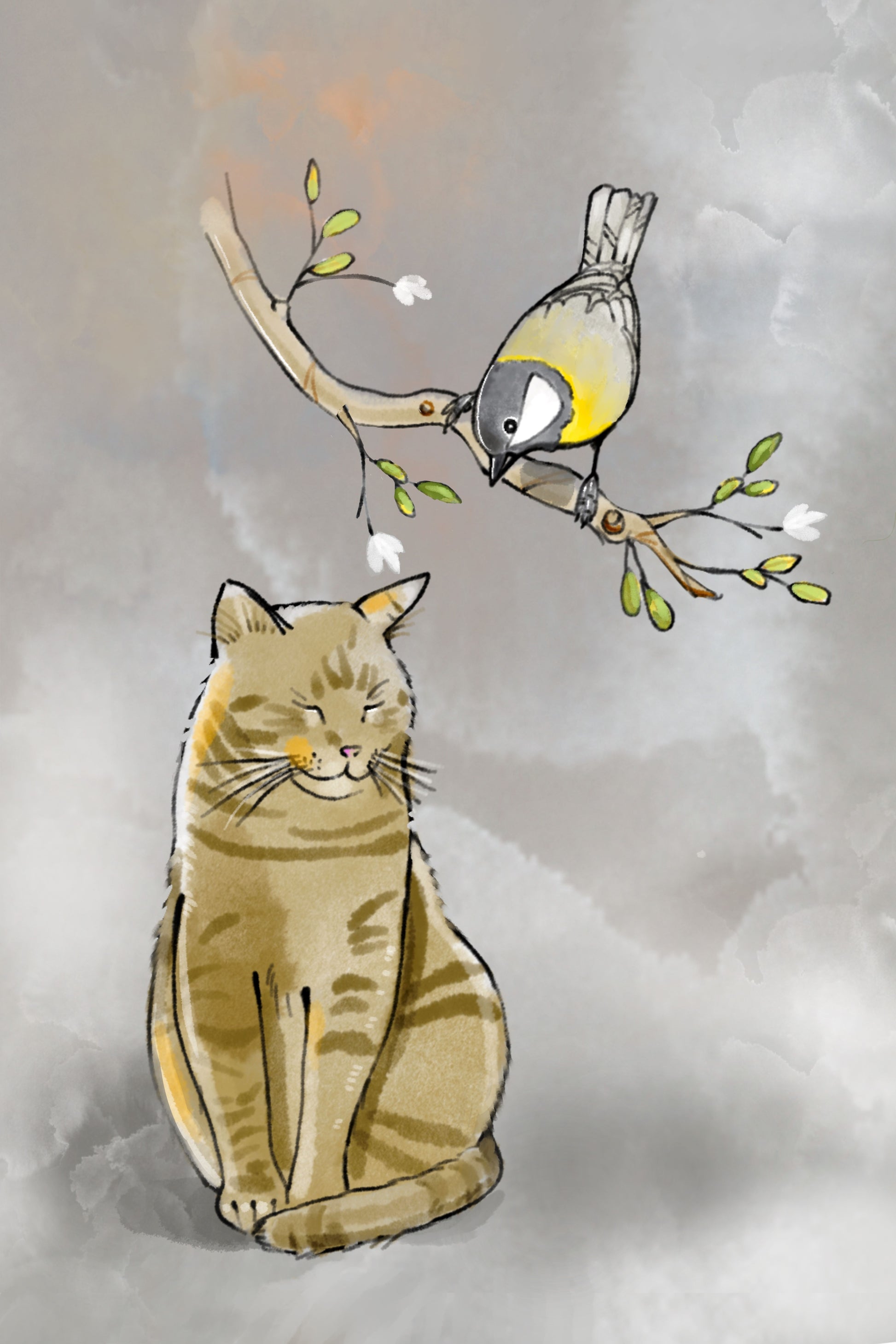 Catnap and Watchful Bird - Illustrated Print by Thomas Little
