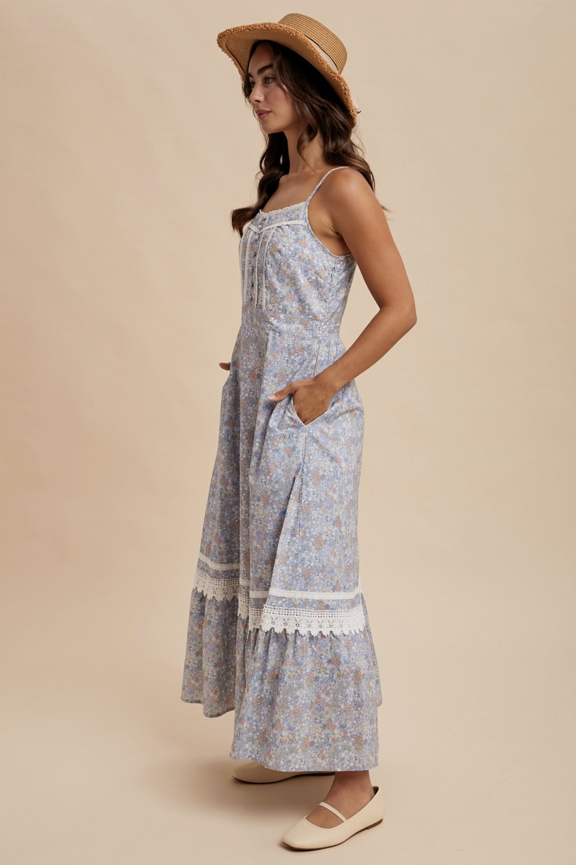 Cotton Floral Lace Trim Maxi Dress - Dusty Blue - By In Loom®