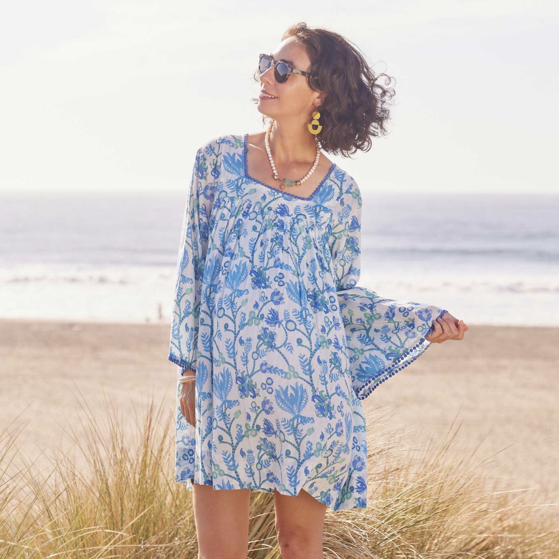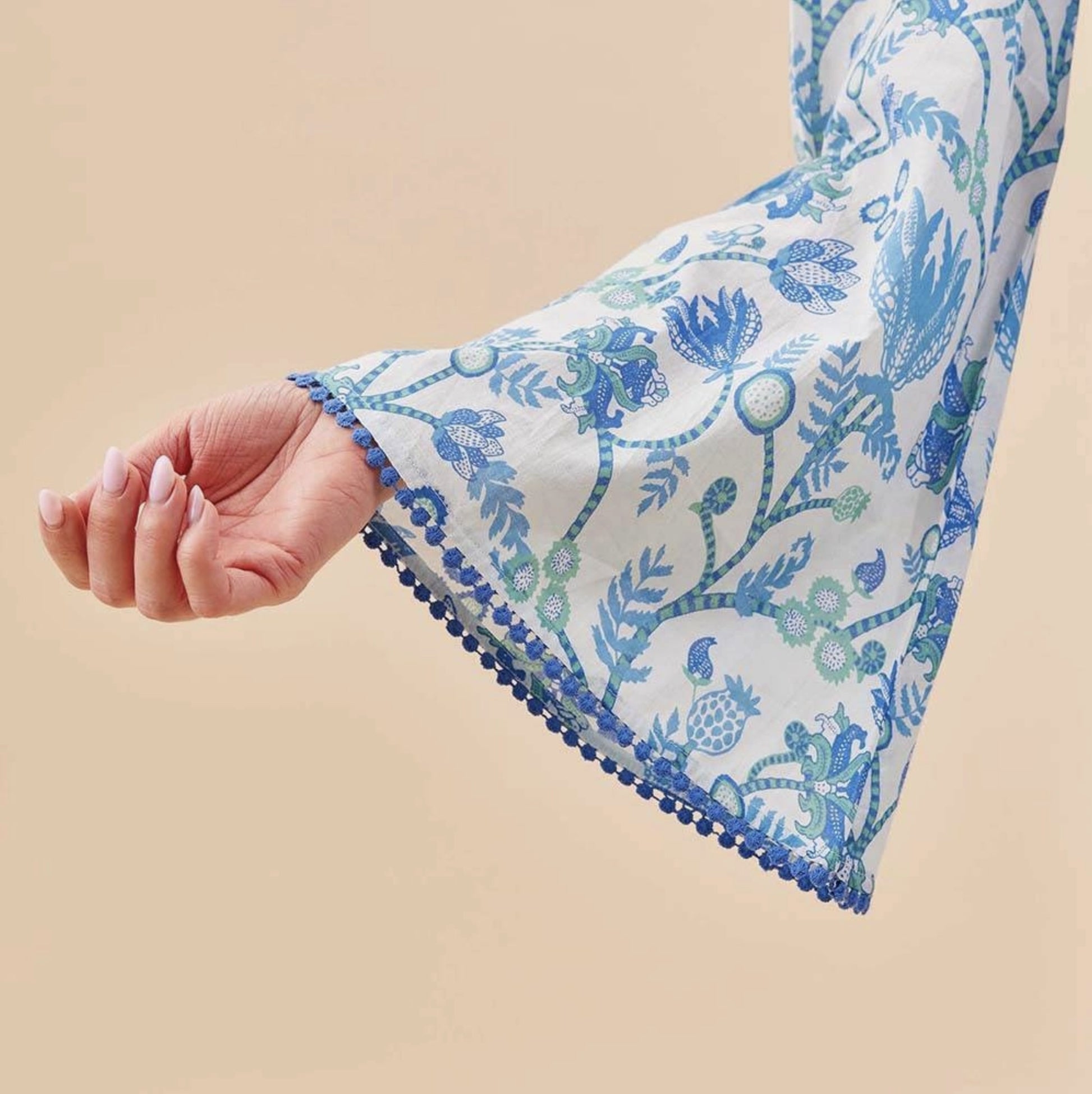 The Gemma Ocean Cotton Dress with Bell Sleeves is the perfect blend of coastal charm and effortless style. Crafted from Blu Threads, our eco-friendly fabric (85% recycled cotton, 15% virgin cotton), this lightweight, breathable dress is ideal for warm-weather days. The vibrant blue ocean-inspired print evokes a fresh seaside feel, while the delicate kingri lace detail at the neckline and cuffs adds a bohemian elegance. Flowing bell sleeves and a relaxed silhouette provide an airy, flattering fit—perfect for beachside strolls, resort lounging, or summer outings.