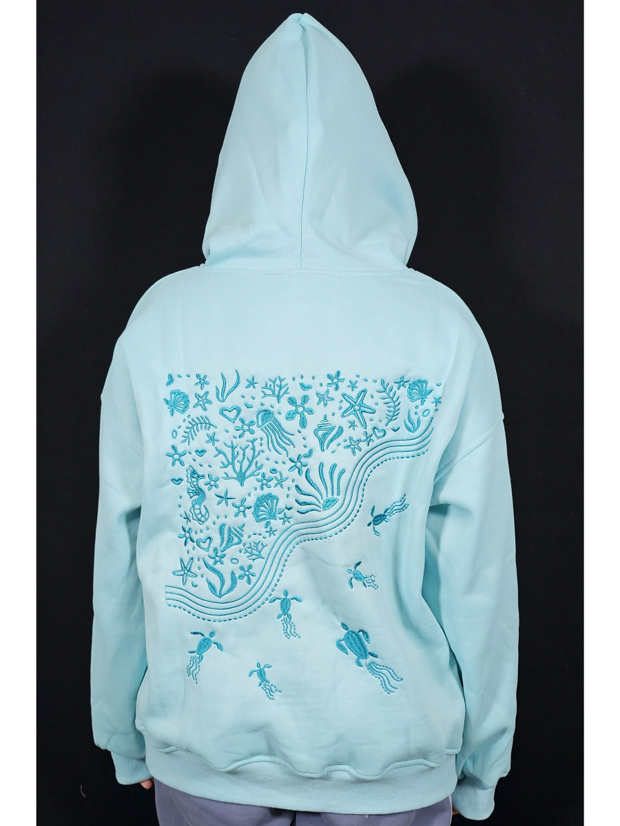 Carry the ocean with you 🌊🐚. Our 'Gift from the Sea' Oversized Hoodie in beautiful seafoam blue is a true statement piece. The back features intricate turquoise embroidery depicting sea turtles, jellyfish, starfish, and seaweed—a stunning piece of wearable art! This cozy, relaxed fit is perfect for beach trips or dreaming of the coast all year long.