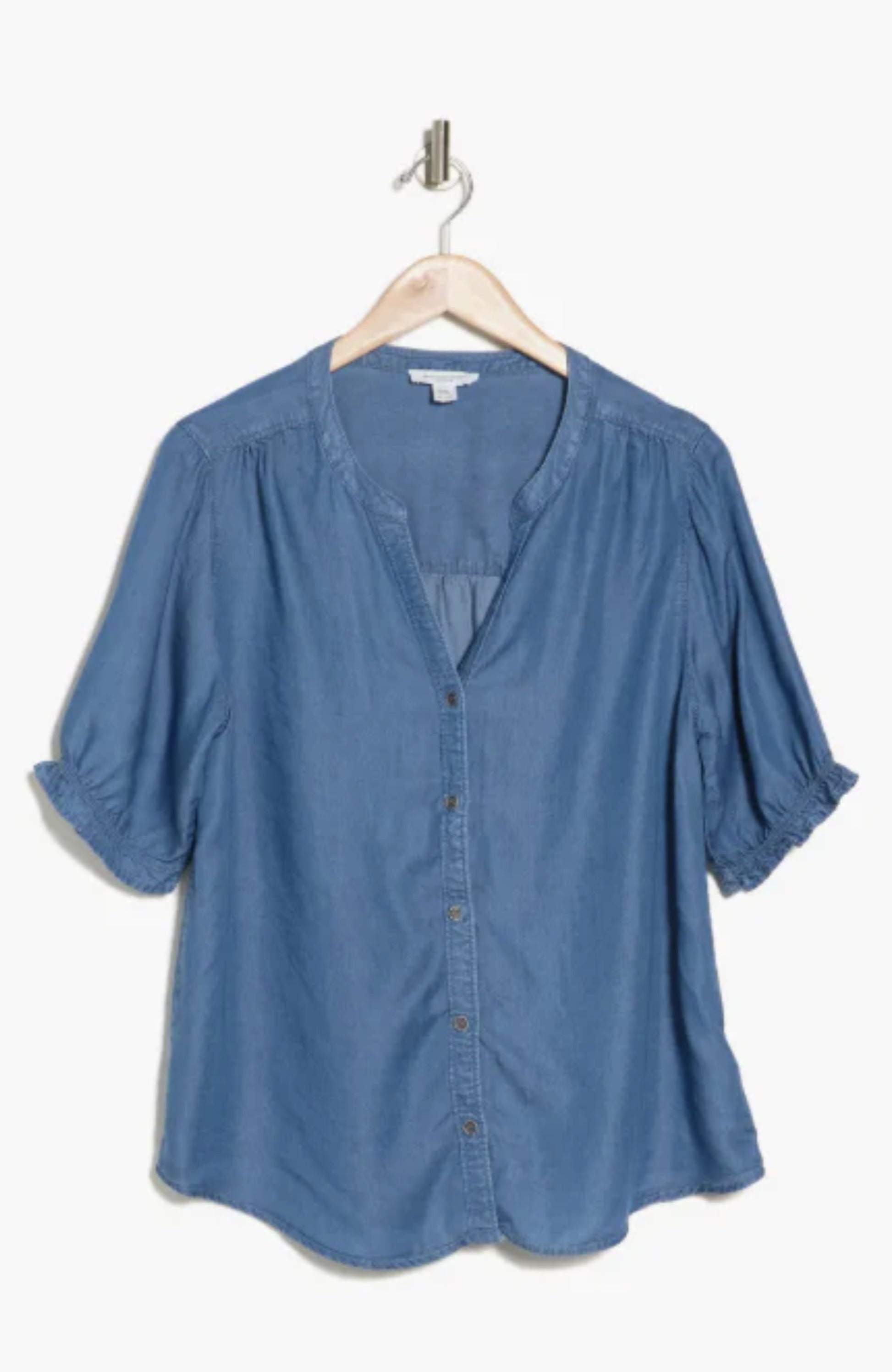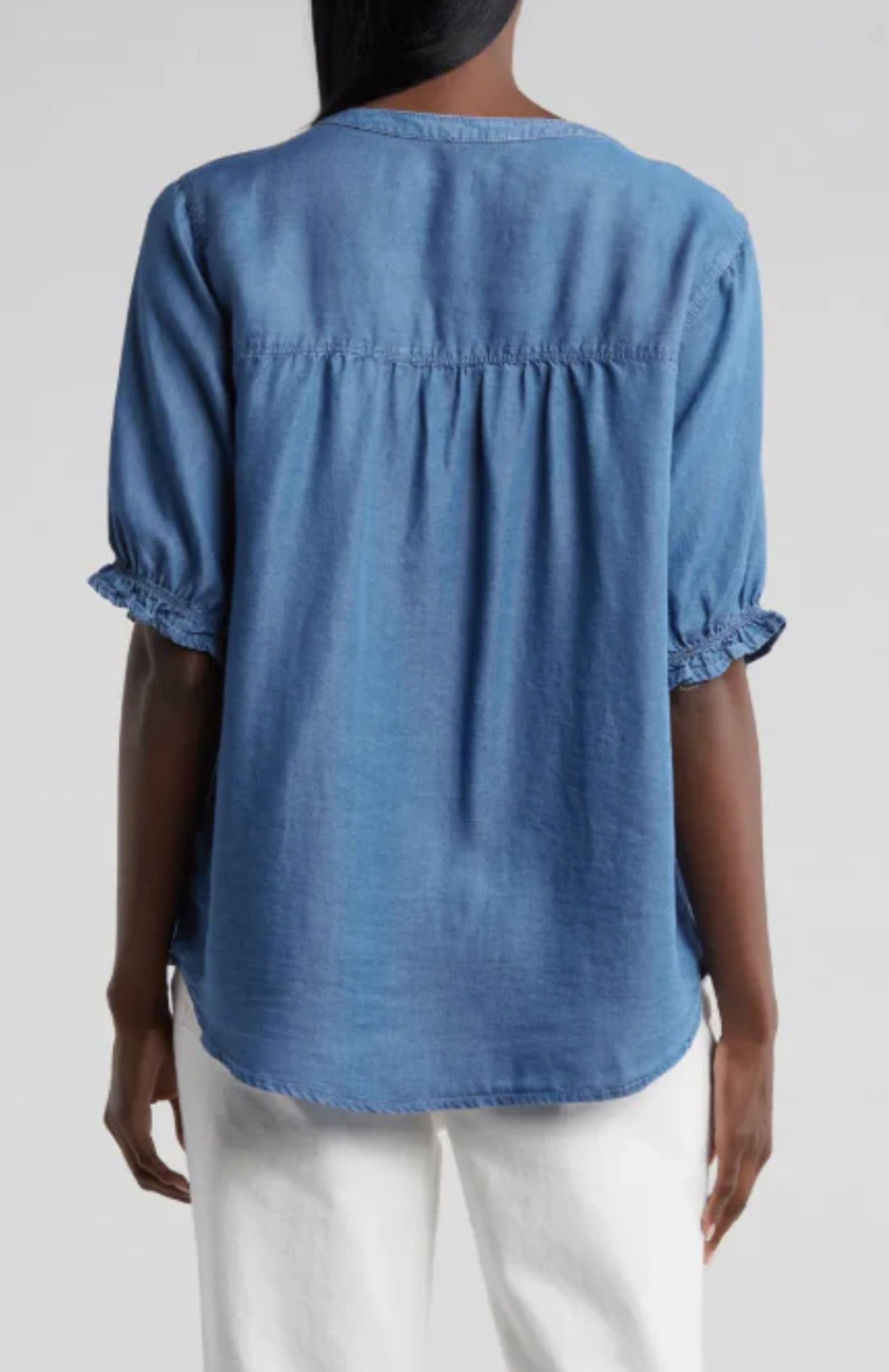 Amp up your casual-cool vibe in this denim shirt designed with a split neck and frill-trimmed sleeves.