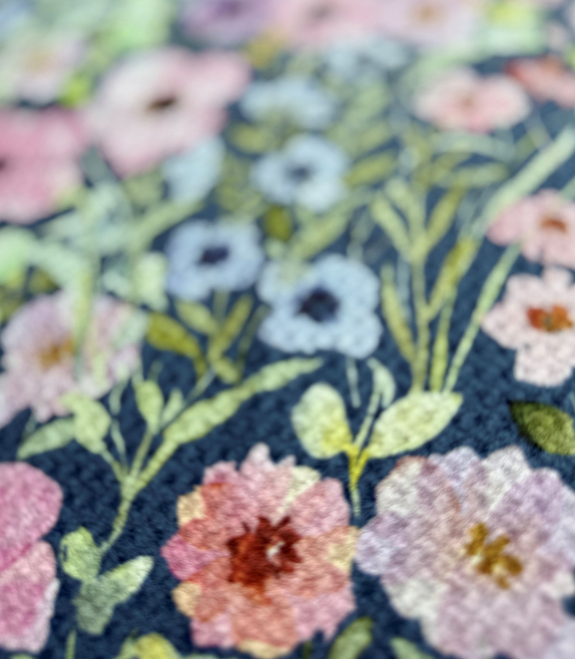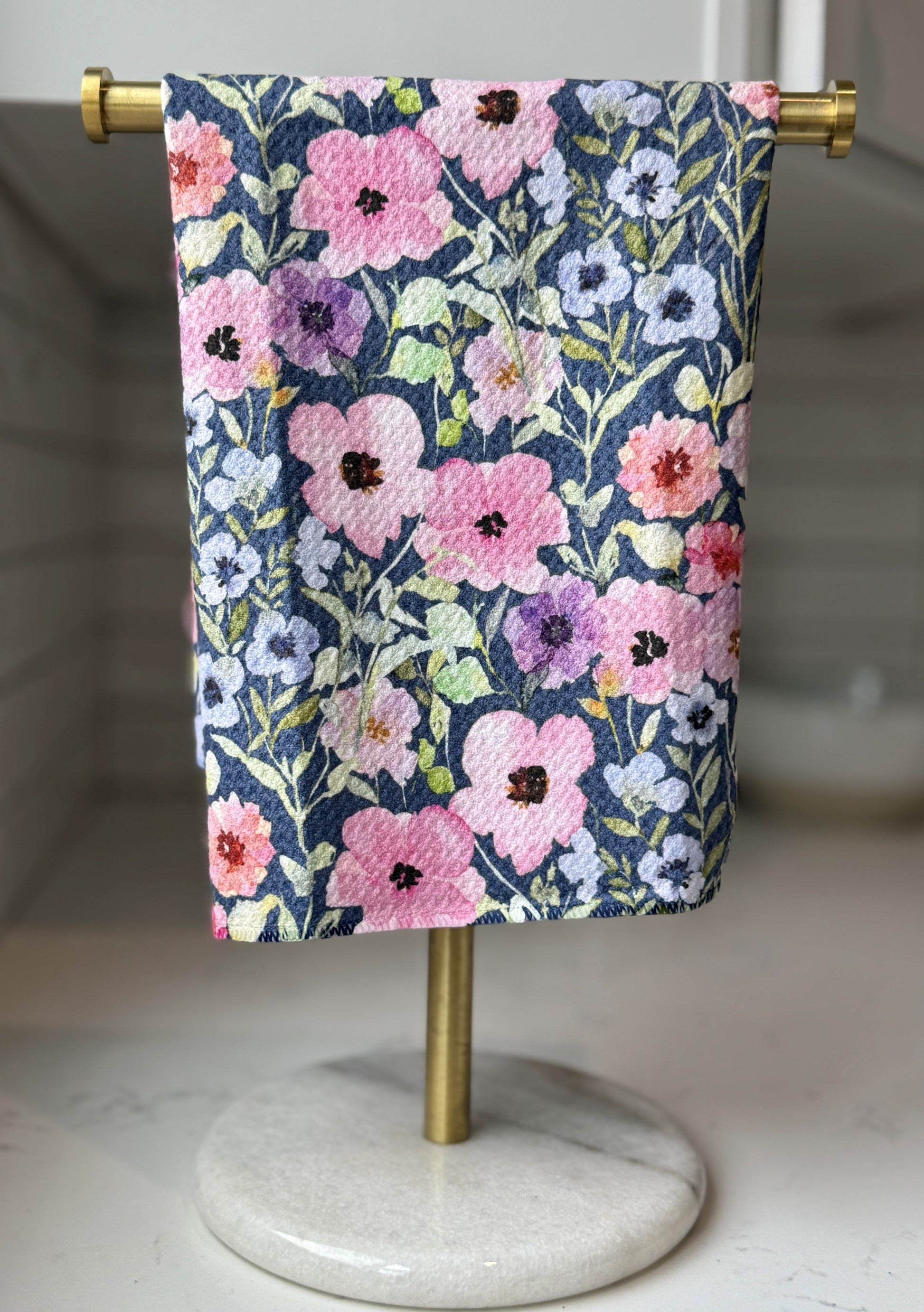 Bring a touch of charming color to your kitchen with our Soft Bloom Tea Towel. This delightful tea towel features a beautiful watercolor-inspired design with soft pink, periwinkle blue, and lavender flowers, complemented by gentle green foliage, all set against a textured navy background. Perfect for drying dishes, adding a sweet and artistic touch to your kitchen decor, or as a lovely gift. Made from high-quality, absorbent fabric for everyday use. Let the gentle beauty of a blooming garden enhance your home.