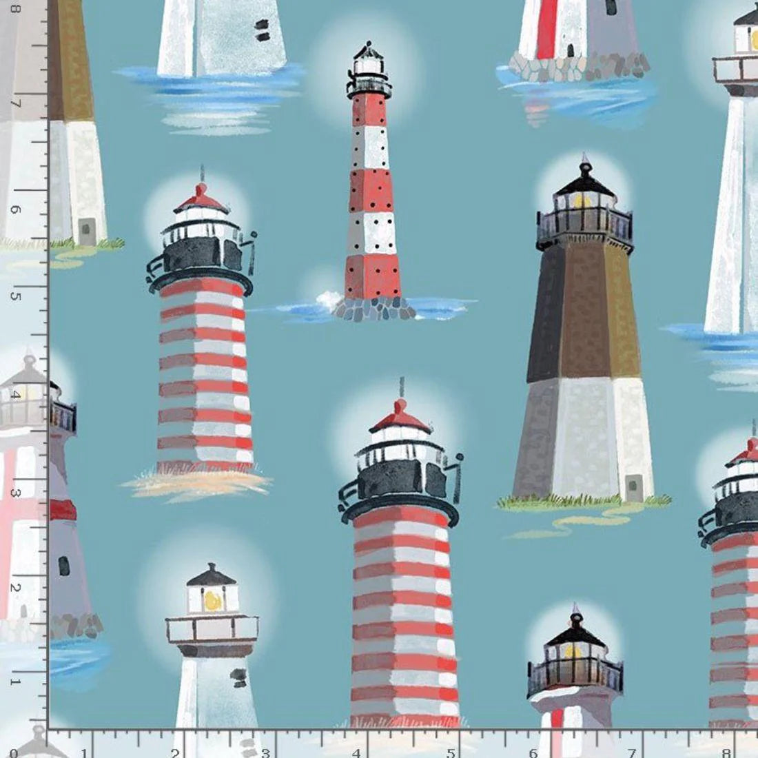 This fabric was made in USA with 100% quilt weight cotton, lighthouses flow over a teal background.