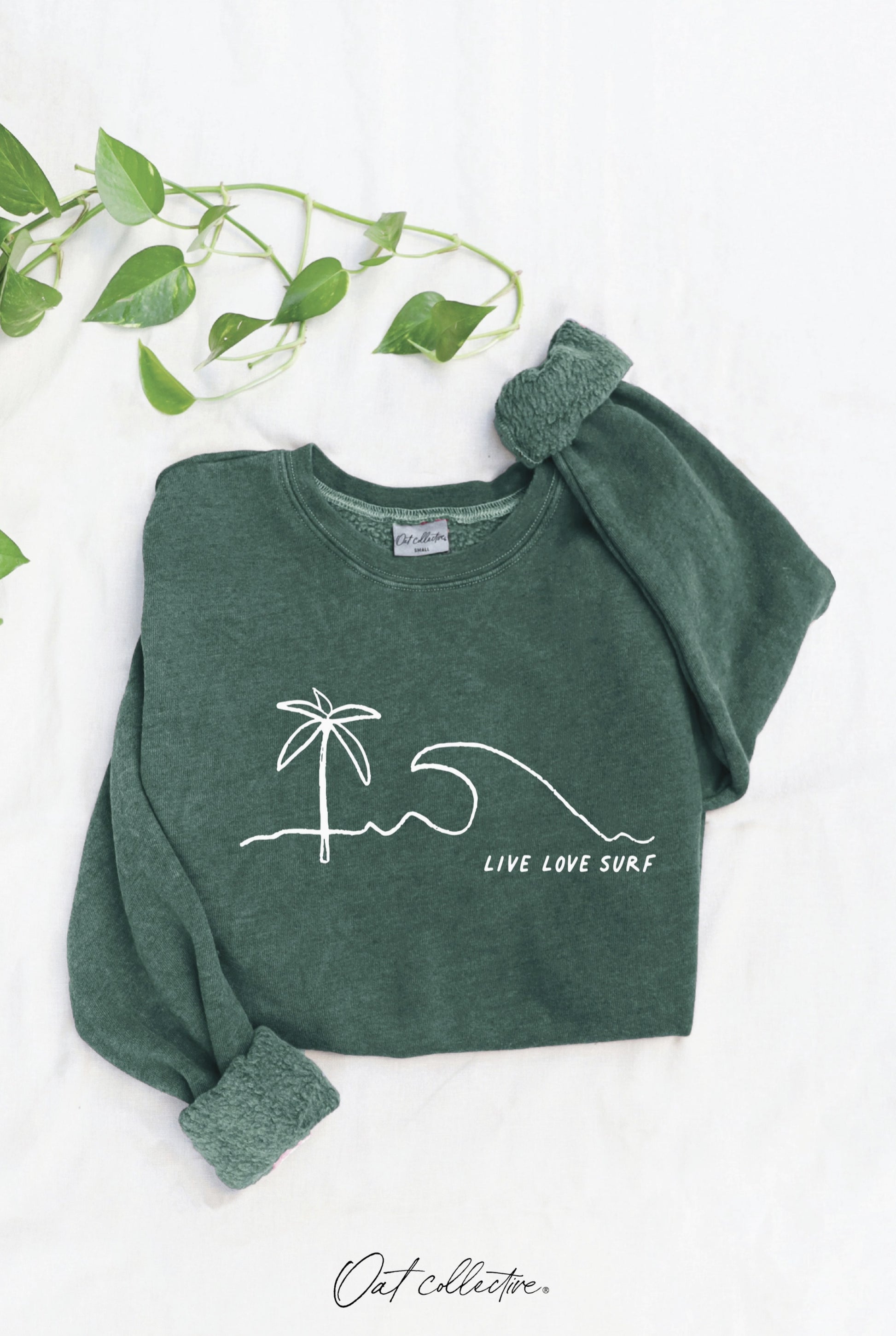 Live Love Surf Mineral Graphic Sweatshirt (Dust Forest color) - by OAT COLLECTIVE