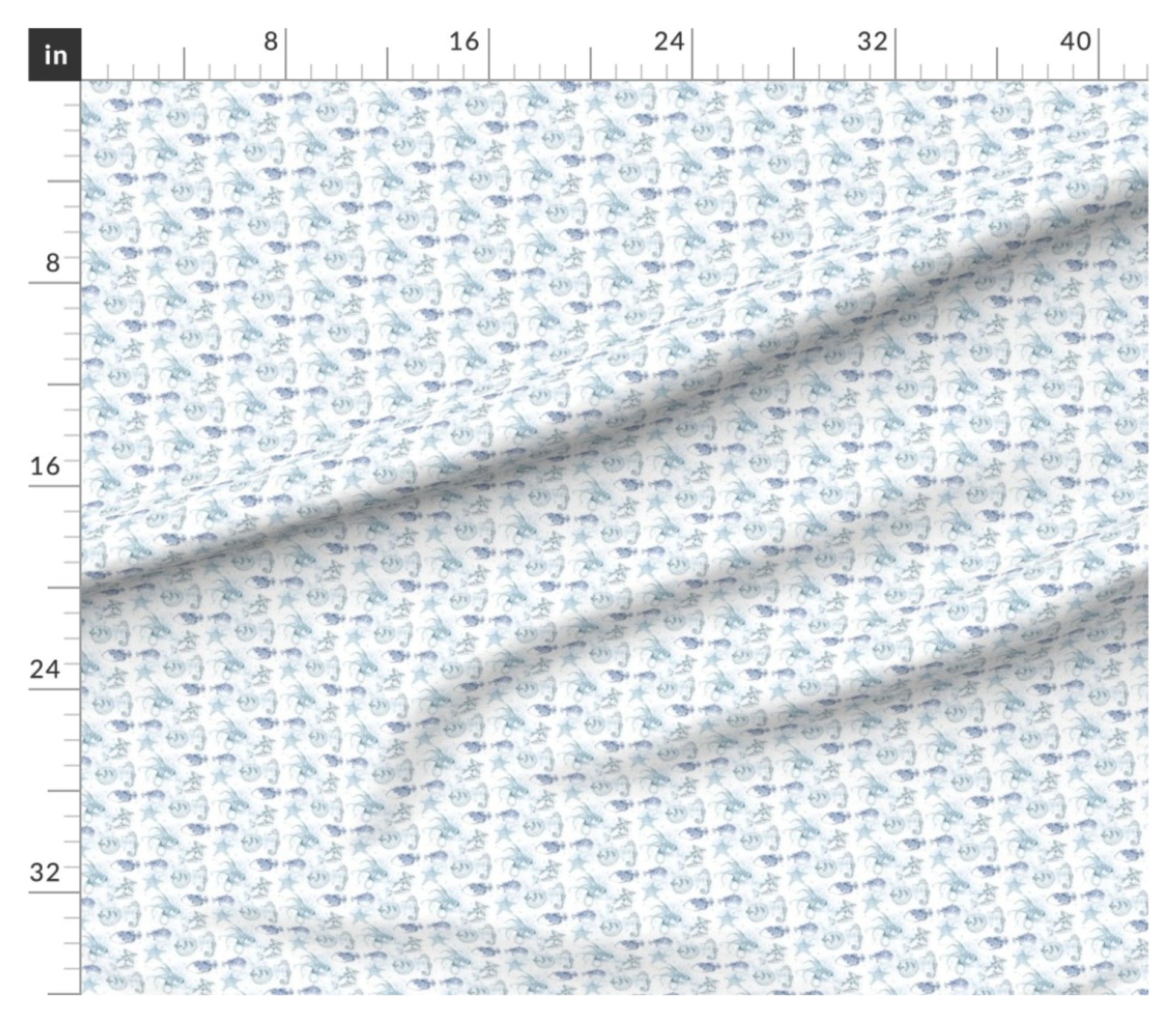This fabric was made in USA with 100% quilt weight cotton, Marine wildlife flow over a white background.