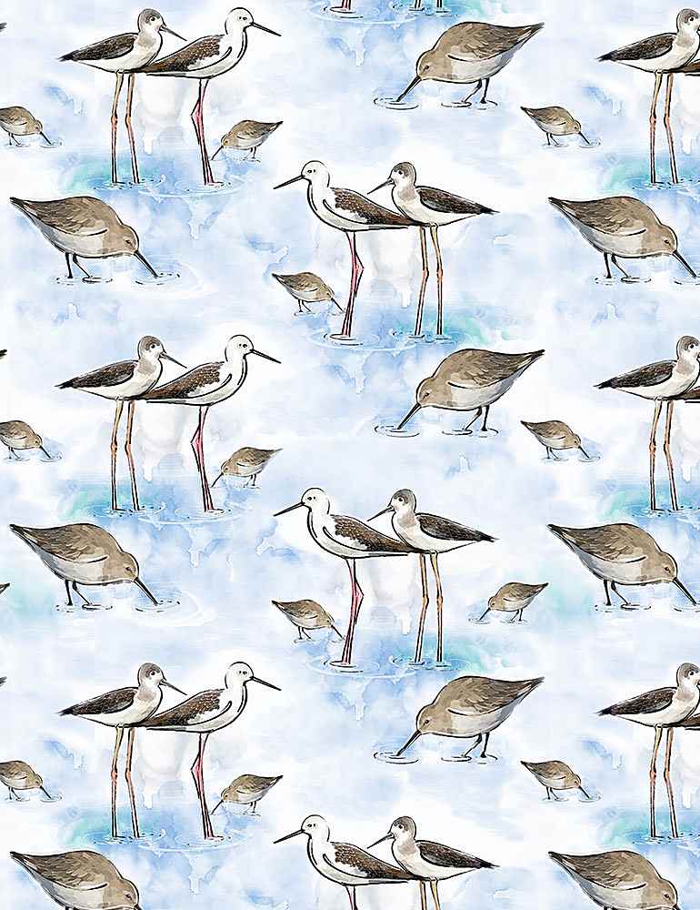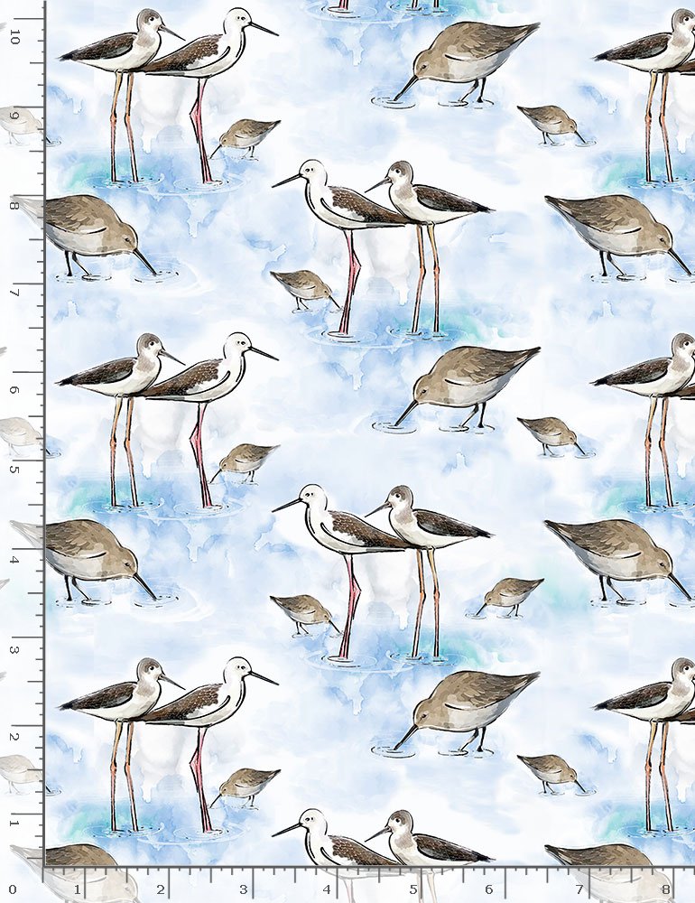 This fabric was made in USA with 100% quilt weight cotton, Sand pipers birds stand and feed in pools of mottled blue and white.