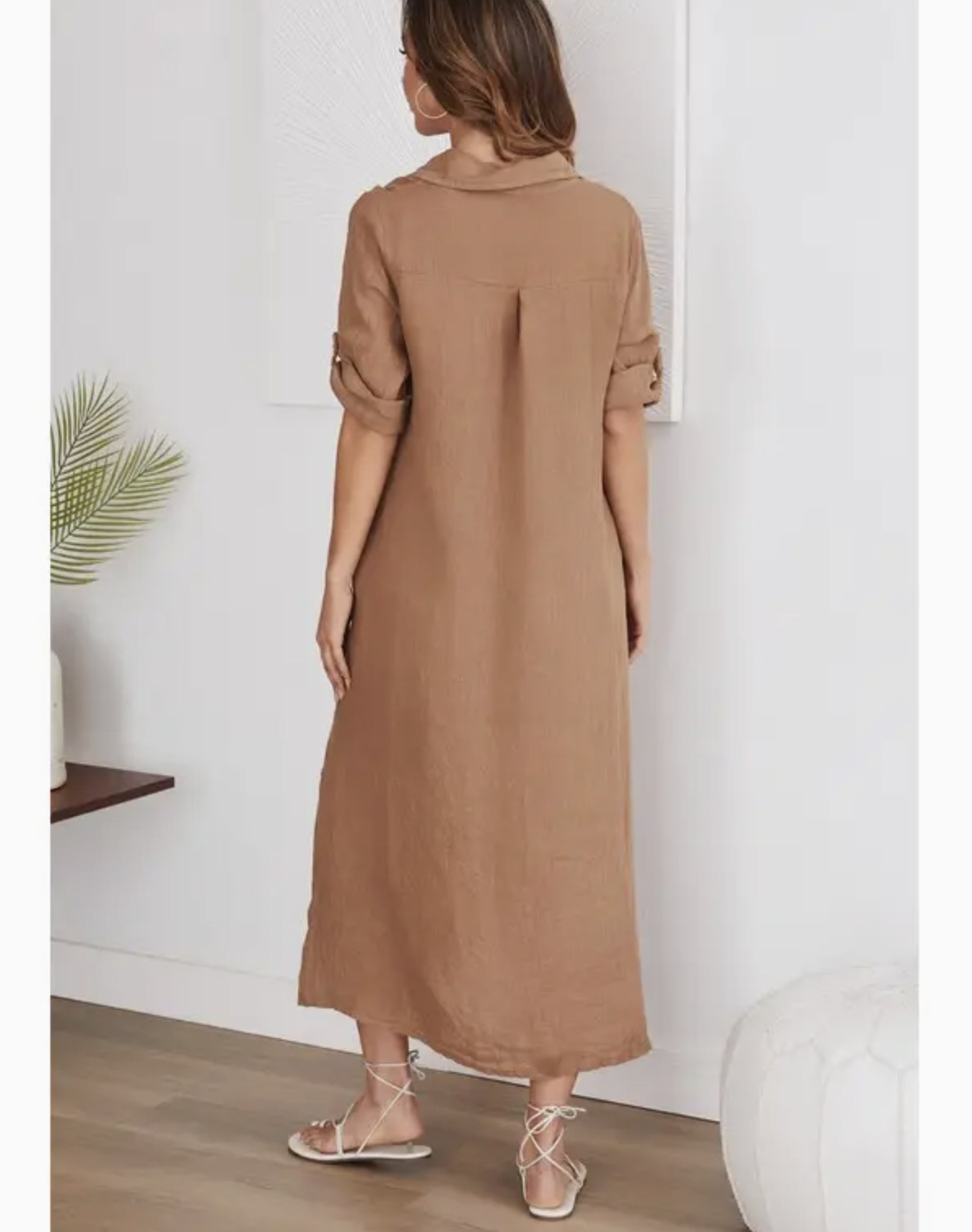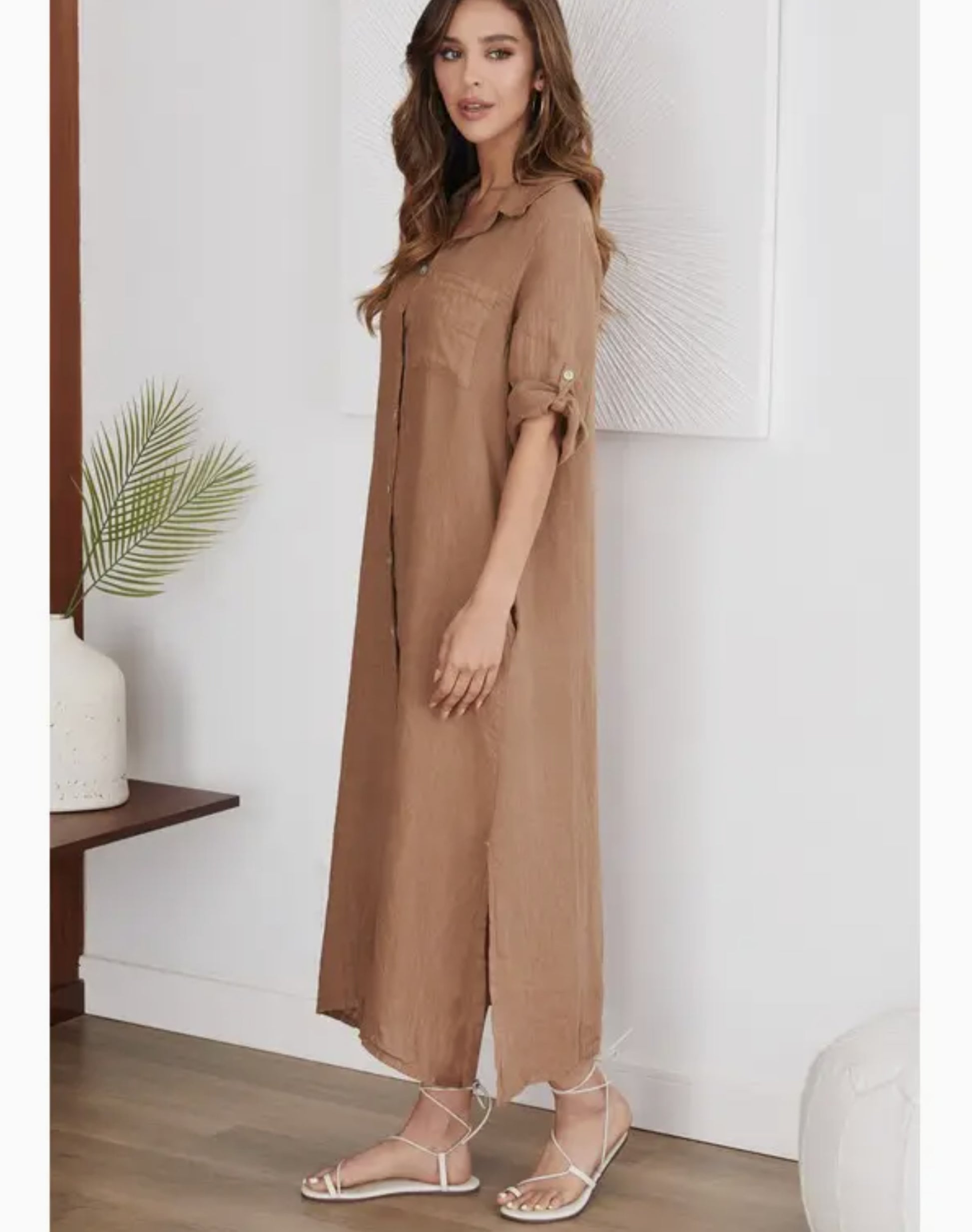 Short Sleeve Button Down Linen Long Dress - by Venti6® (Camel Color)