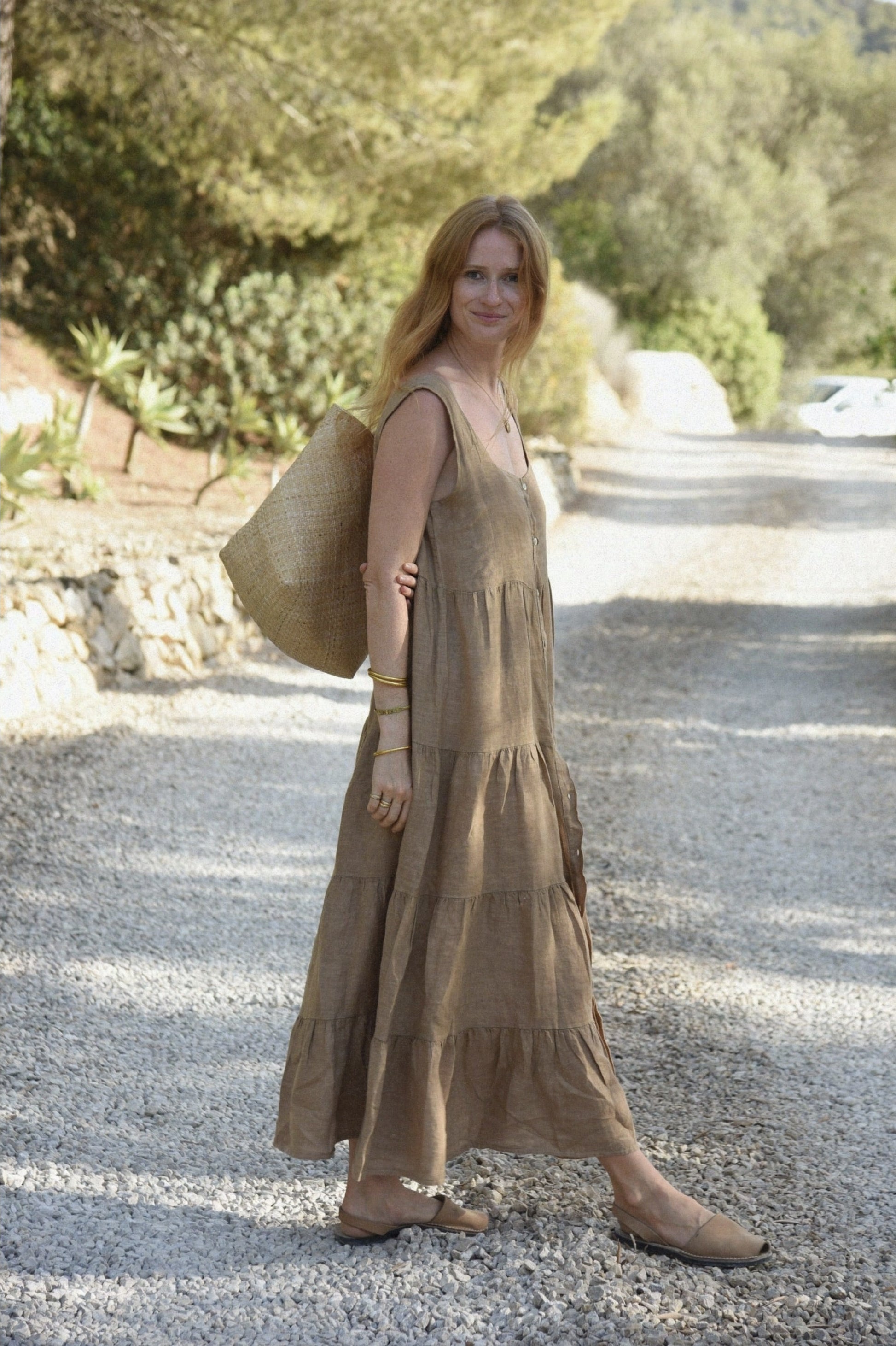 The Willow Dress is flowy, feminine, and perfect for any occasion. Easily paired with a light sweater for colder days, or worn by itself for the ideal summer dress. A maxi dress, with beautiful tiered design and mother of pearl buttons all down the front, allowing for a versatile approach to dressing, and a square neckline adds extra boho elegance. The dress has some structure while leaving plenty of room for comfort and style. Designed to be maternity and breastfeeding friendly, for a timeless approach to dressing