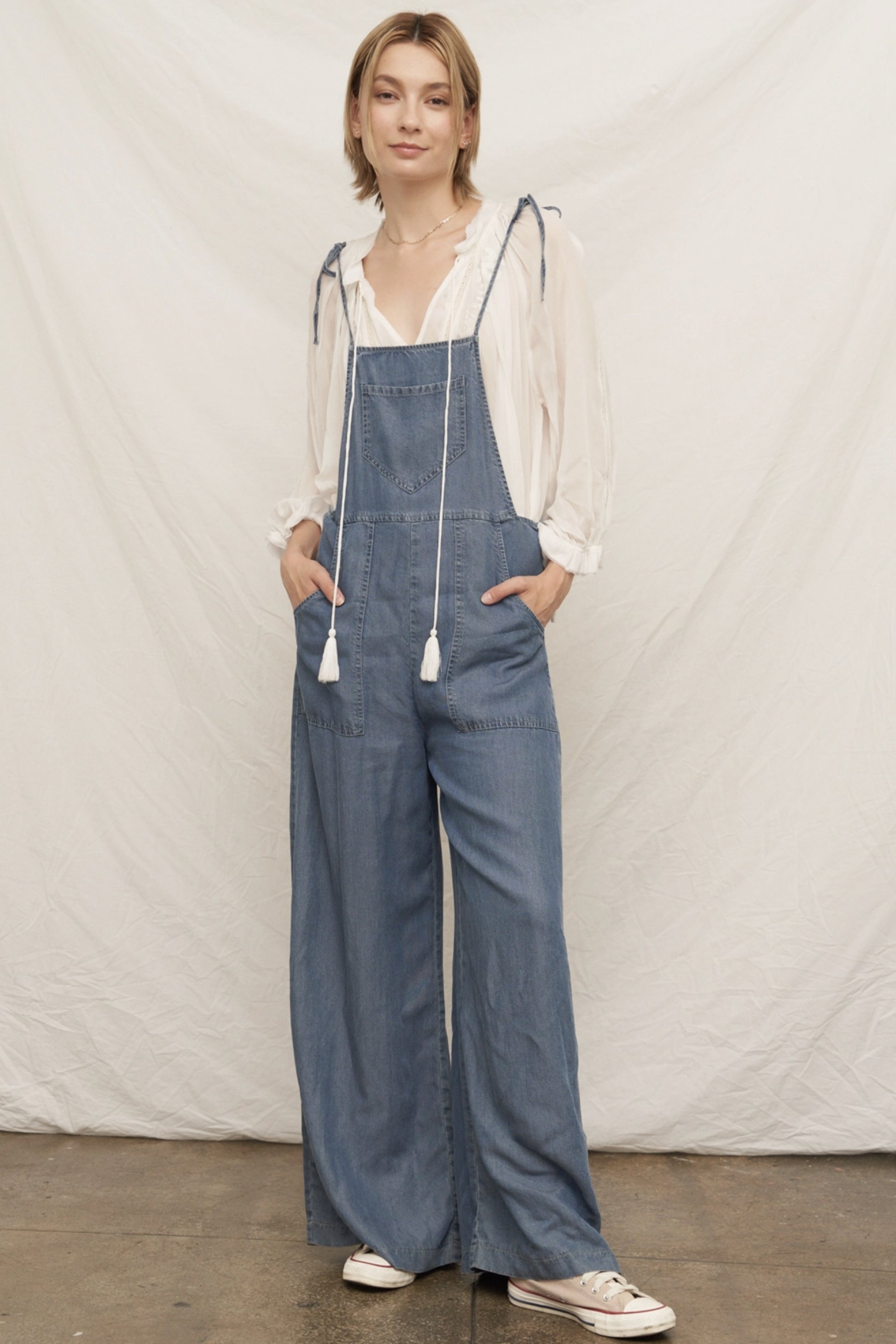 Tie Shoulder Soft Denim Wide Leg Jumpsuit