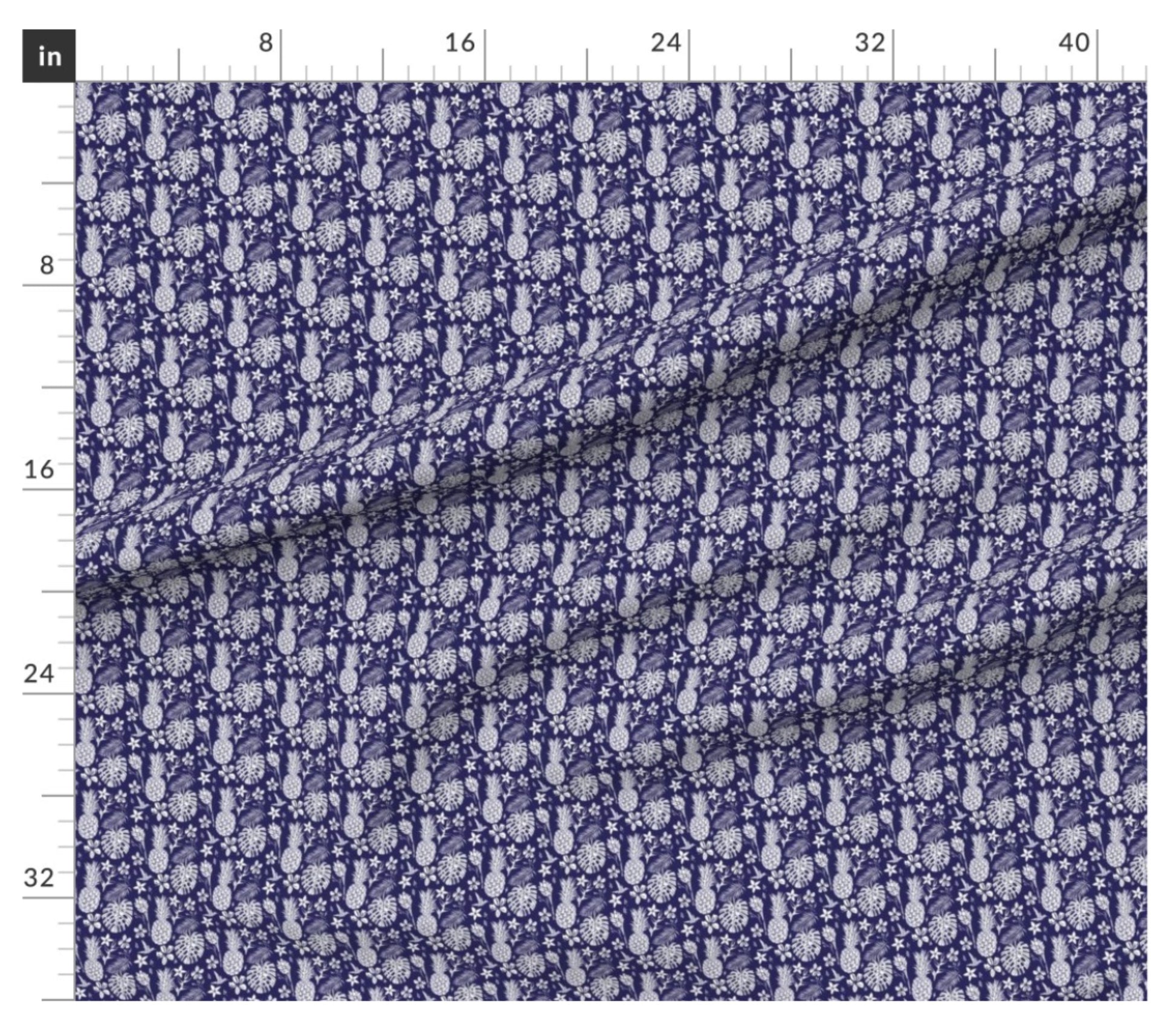This fabric was made in USA with 100% quilt weight cotton, Pineapples and some leaves flow over a dark blue background.